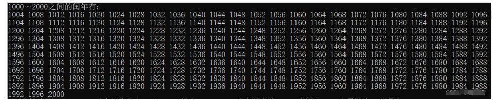这个思路就和上面的第一题比较类似了,就是把1000到2000里的每一个数都进行判断,判断其是否符合可以被4整除而不能被100整除,或者是可以被400整除。要对每一个数进行判断可以使用for循环来实现。