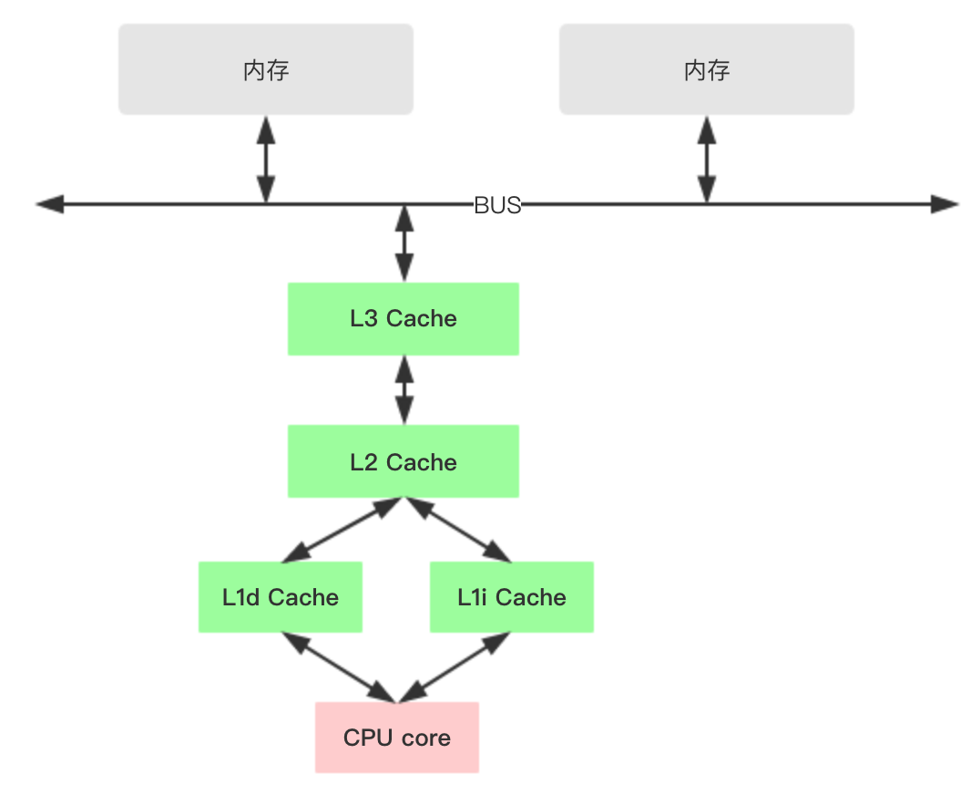 2、L1 Cache,一级缓存,本地core的缓存,分成32K的数据缓存L1d和32k指令缓存L1i,访问L1需要3cycles,耗时大约1ns;