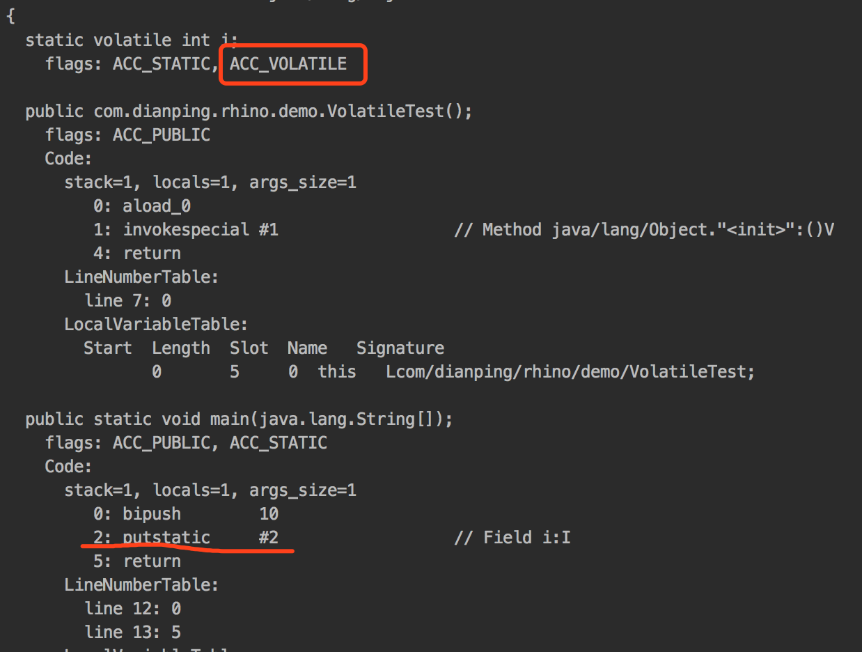 这段代码本身没什么意义,只是想看看加了volatile之后,编译出来的字节码有什么不同,执行 javap -verbose VolatileTest 之后,结果如下: