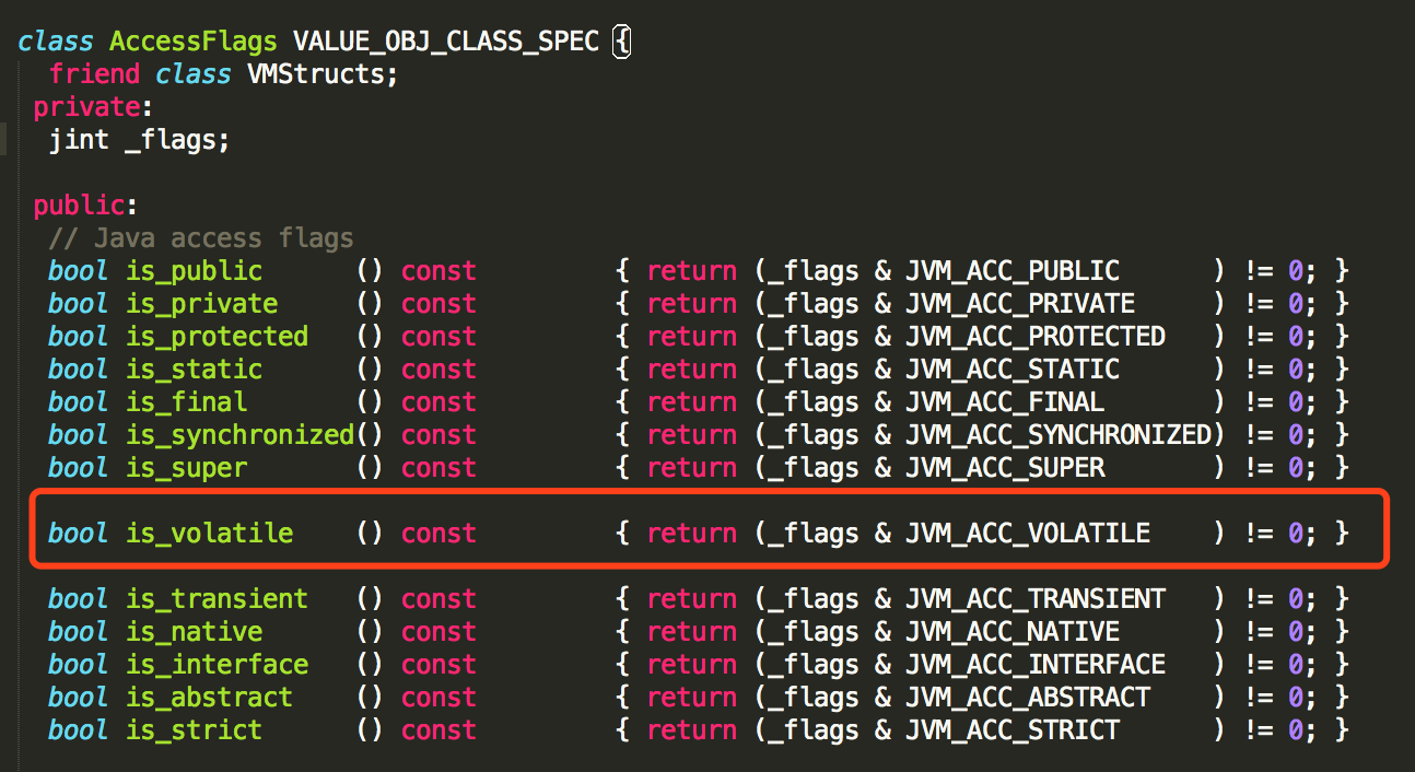 不过,我觉得可以从这个标识入手,先全局搜下 ACC_VOLATILE ,无从下手的时候,先看看关键字在哪里被使用了,果然在accessFlags.hpp文件中找到类似的名字。