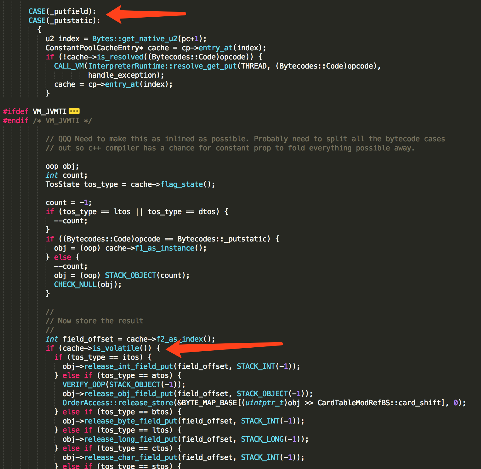 通过 is_volatile() 可以判断一个变量是否被volatile修饰,然后再全局搜”is_volatile”被使用的地方,最后在 bytecodeInterpreter.cpp 文件中,找到putstatic字节码指令的解释器实现,里面有 is_volatile() 方法。