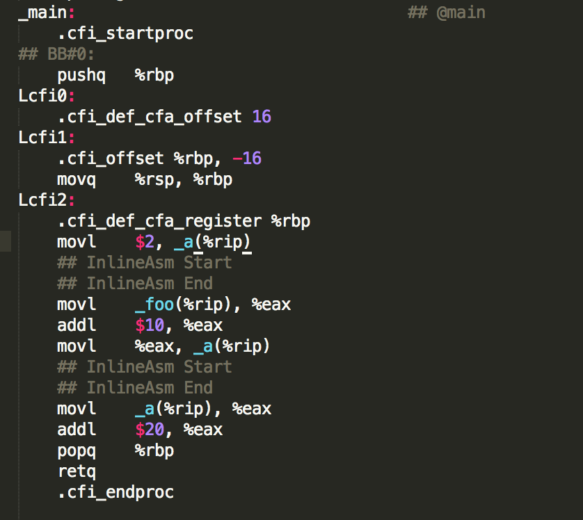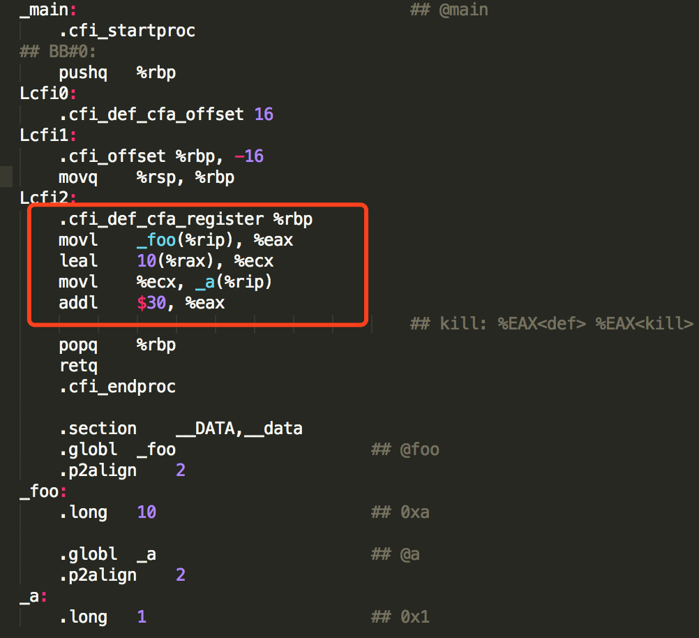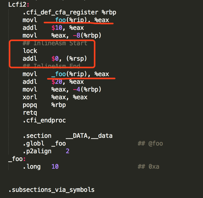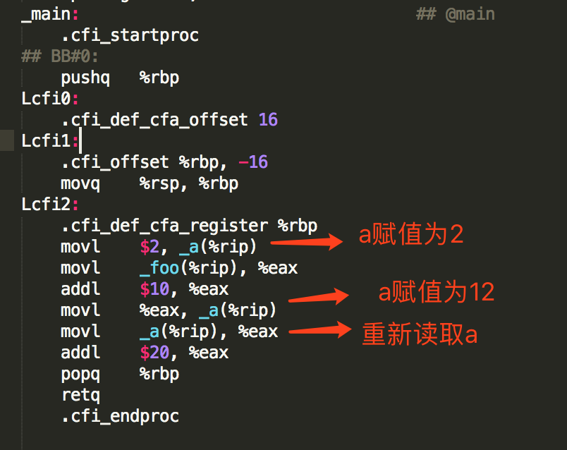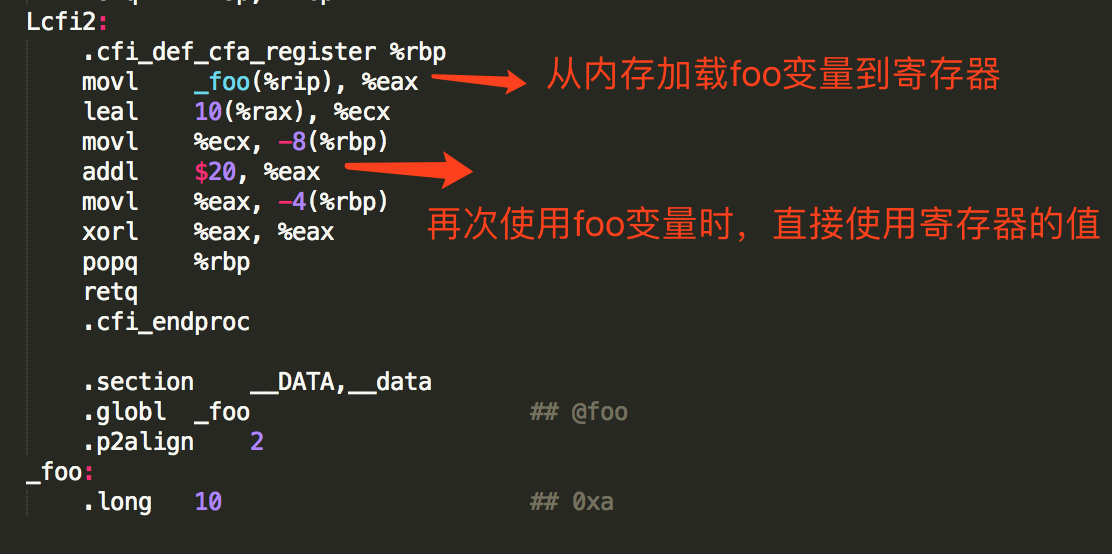 从编译后的代码可以发现,第二次使用foo变量时,没有从内存重新加载,使用了寄存器的值。