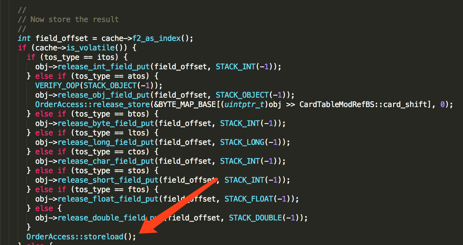 其中cache变量是java代码中变量i在常量池缓存中的一个实例,因为变量i被volatile修饰,所以 cache->is_volatile() 为真,给变量i的赋值操作由 release_int_field_put 方法实现。