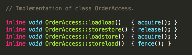 其实这就是经常会念叨的内存屏障,之前只知道念,却不知道是如何实现的。从CPU缓存结构分析中已经知道:一个load操作需要进入LoadBuffer,然后再去内存加载;一个store操作需要进入StoreBuffer,然后再写入缓存,这两个操作都是异步的,会导致不正确的指令重排序,所以在JVM中定义了一系列的内存屏障来指定指令的执行顺序。