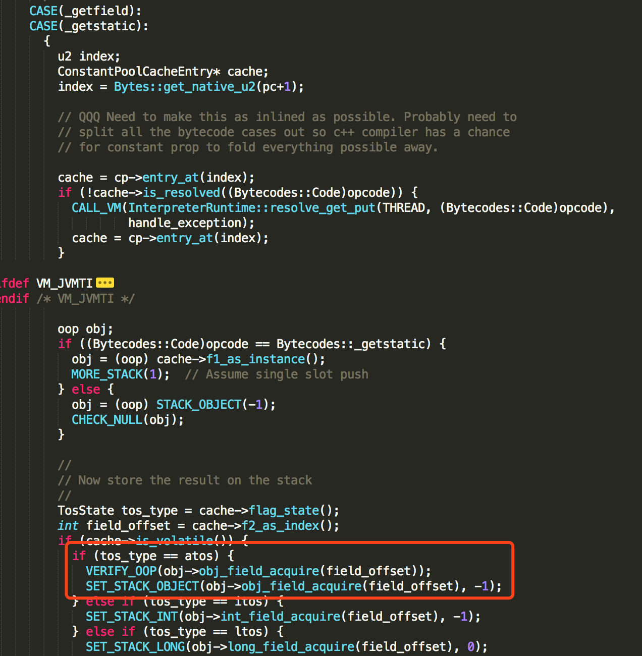 同样在 bytecodeInterpreter.cpp 文件中,找到getstatic字节码指令的解释器实现。